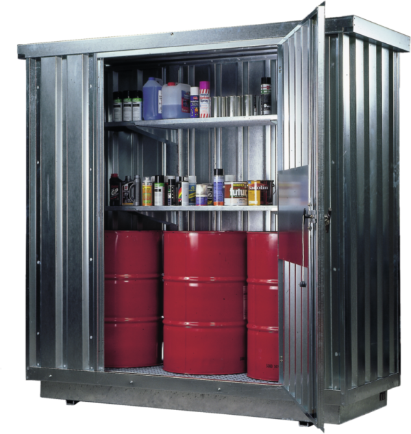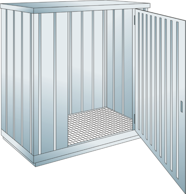 GALVANISED VERSION: Dimension: 915 x 2350 x 2340 (LxWxH in mm) Capacity: 3000 l Approval for storage of water polluting liquids WGK 1 – 3, flammable liquids, F+, F outdoors or in building in accordance with the specific fire protection regulations. Construction of container: